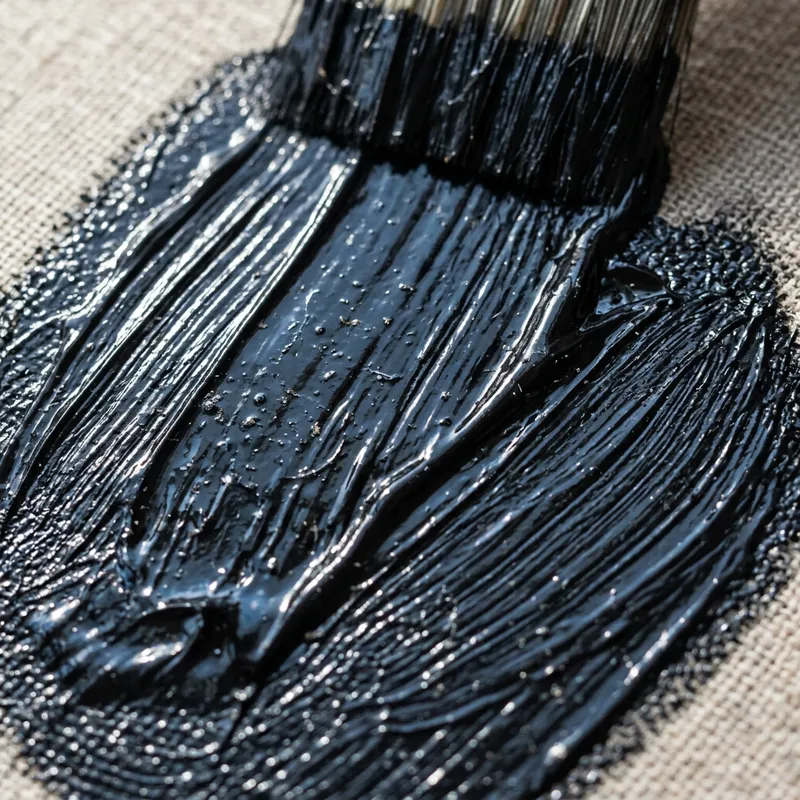 A close up of a thick, glossy layer of black paint applied with a wide brush on a canvas. The light is reflecting off the still-wet paint, illuminating the varying hues and textures within the black pigment. Tiny particles of dust are barely noticeable in the layer of paint, giving it a slightly gritty texture that contrasts with its otherwise smooth and shiny finish