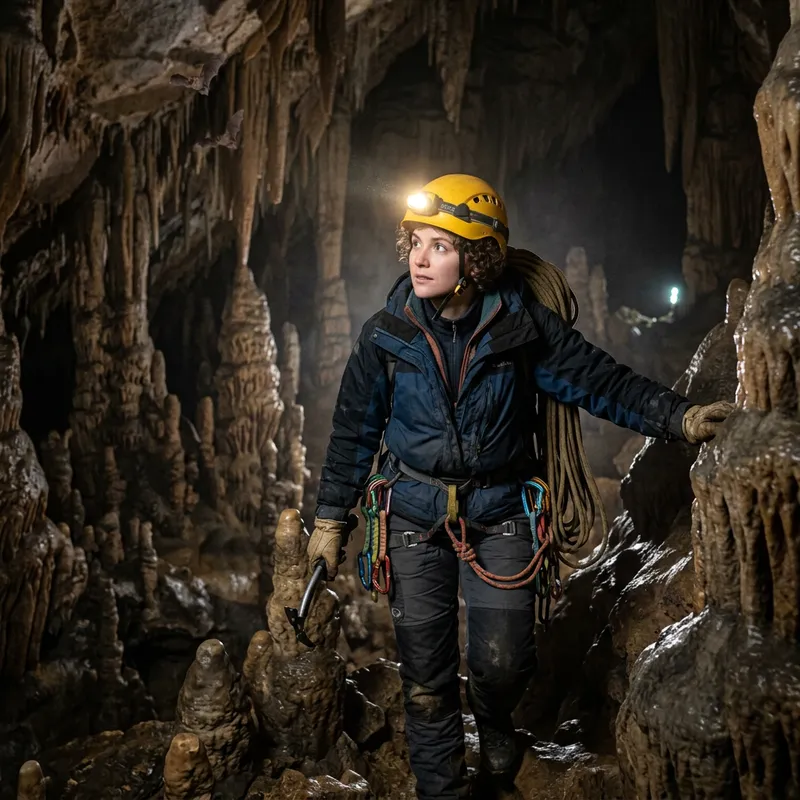 Generate an image portraying a spelunker. This individual should be clad in typical gear like a hard hat with lamp, climbing ropes, and protective clothing. The background should be a deep, intricate cave with intricate stalagmites and stalactites looming in the semi-darkness. To add a touch of realism you might include a climbing pick in their hand, spare carabiners on their belt, and maybe a bat fluttering in the background for good measure.