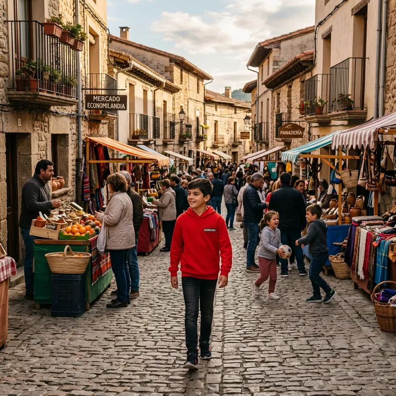 A boy in a red hoodie walking through a town in Economilandia, surrounded by quaint houses and bustling marketplace. People are chatting, kids playing, and vendors selling various goods. The narrow cobblestone streets wind around charming makeshift stalls. The afternoon sun casts long shadows, adding depth and contrast to everything in the town. The boy's red hoodie stands out among the sea of neutral tones, making him the center of attention. The cool breeze sways his hoodie's strings as he strides confidently, filled with the curiosity of exploring the sounds, colors, and scents of Economilandia.