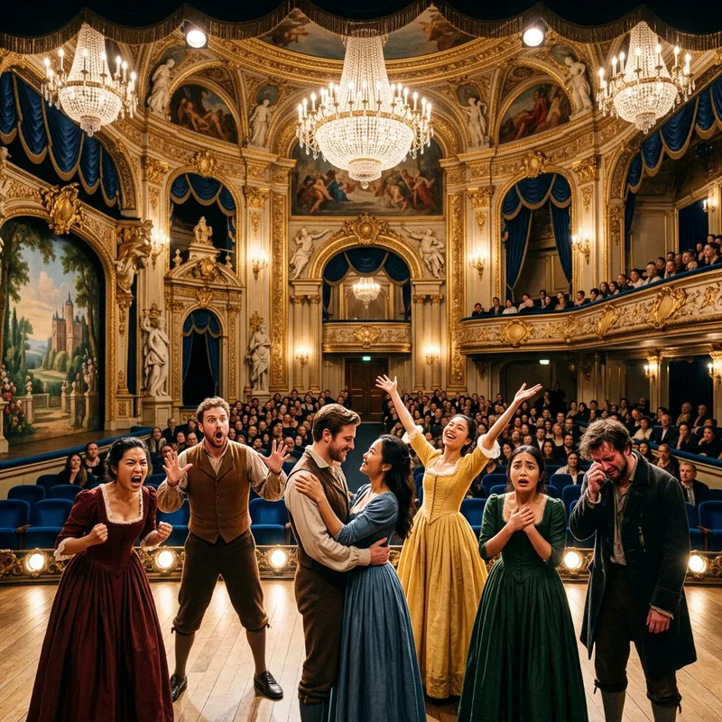 Illustrate a conceptual image focusing on human emotions. Display a group of Asian female and Caucasian male actors on stage, each portraying a different feeling - happiness, sadness, fear, surprise, anger, and love. The setting is a well-lit, opulent baroque theatre adorned with gilded sculptures and ornate chandeliers. Audience members are watching attentively from royal blue velvet seats. The atmosphere is intense yet captivating, as the raw emotions from the actors ripple across the stage and into the auditorium. Include detailed expressions and gestures to highlight these emotions.