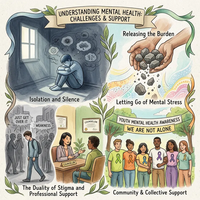 Depict a thoughtful collection of illustrations that delve into the complex theme of mental health. Picture different scenarios such as a person sitting alone in a quiet room, symbolizing the isolation often associated with mental health struggles, a pair of hands releasing a burden of rocks, signifying the release of mental stress, and a group of people of various descents and gender with ribbons of different colors (each denoting a different mental health issue). Show a balance of both the challenges faced and the sources of support available -- from professional counselling to friendly ears, illustrating societal stigma and the resources available for support.