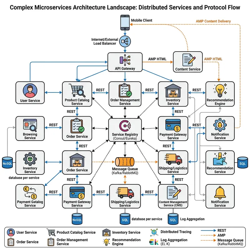 A detailed and intricate architectural diagram showing a microservices landscape. Each individual service is represented by a unique symbol. The communication between these services is indicated with arrows and lines, highlighting the use of REST (REpresentational State Transfer) and AMP (Accelerated Mobile Pages) protocols. Key elements include load balancers, API gateways, service discovery mechanisms, and data stores. Overall, it's a complex and interconnected network with multiple paths for data flow, emphasizing the distributed nature of microservices.