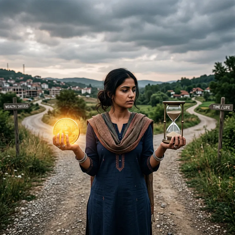 A visual representation of the concept of opportunity cost. In one hand, a person is holding a glowing golden coin, indicating wealth. On the other hand, they have an hourglass, representing time. The hourglass sand is slipping through, and both objects are weighing heavy in the hand. The person caught in this decision-making process is of South Asian descent. The background is a crossroads under a cloudy sky, suggesting the need to choose one path over the other.