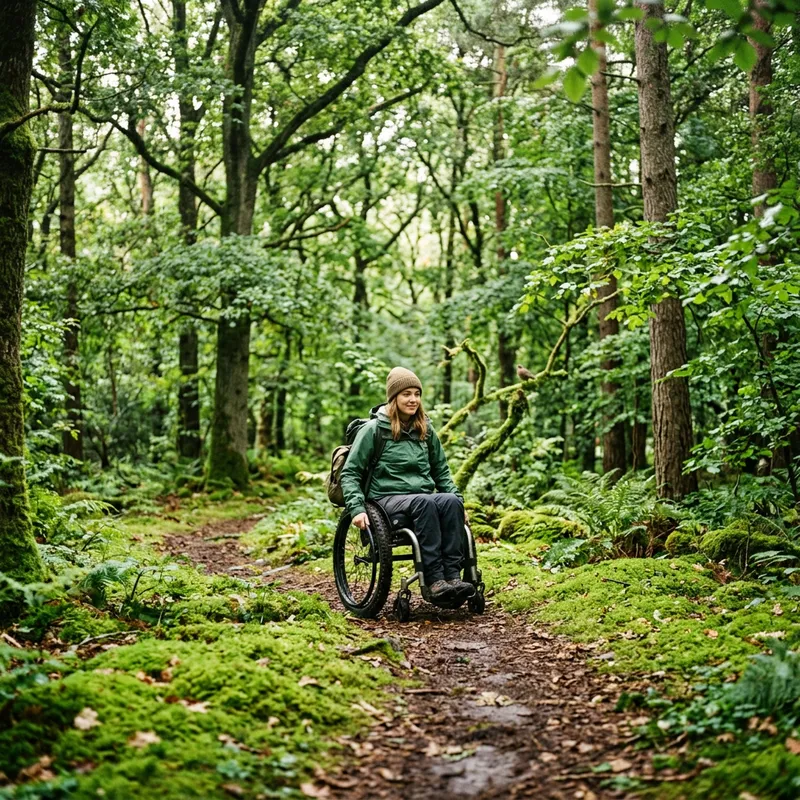 A handicapped individual, bravely exploring the lush and serene forest all by themselves. The forest is rich with tall trees and their leaves rustling in the wind, the ground covered with bright green moss, and the air filled with melodious chirping of various birds.