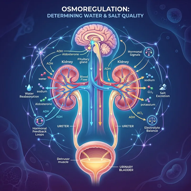 Illustration visually representing the concept of determining the quality of water and salts in the organism. Key elements include: A) The ureter as an illustrative symbol; B) The overall regulatory system suggesting intricate web of connections; C) The bladder visualized with aesthetic accuracy.