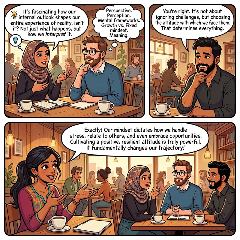 Create a comic strip that shows a strong preference for discussions about attitudes. The comic should have three panels: 1) A Middle Eastern woman and a Caucasian man engaging in deep conversation with thought bubbles denoting philosophical musings. 2) A Hispanic man listening attentively, displaying an understanding expression. 3) A South Asian woman offering her perspective, with her speech bubble filled with insights about attitudes and mindset.