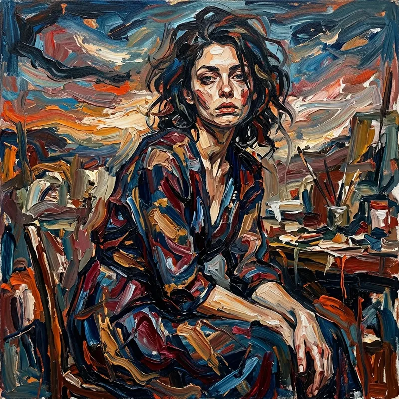 Expressionist oil painting. Medium shot. A sexy female model, expressive brushstrokes and thick impasto, conveying raw emotion and energy, blending Edvard Munch's intense landscapes, Egon Schiele's ecstatic expressiveness, and Willem de Kooning's dynamic strokes, and layered with Chaim Soutine's emotional fervor, infused with primal energy, vibrant colors, and bold lines, echoing Francis Bacon, Jean-Michel Basquiat, and Georges Rouault's neo-expressionist styles.