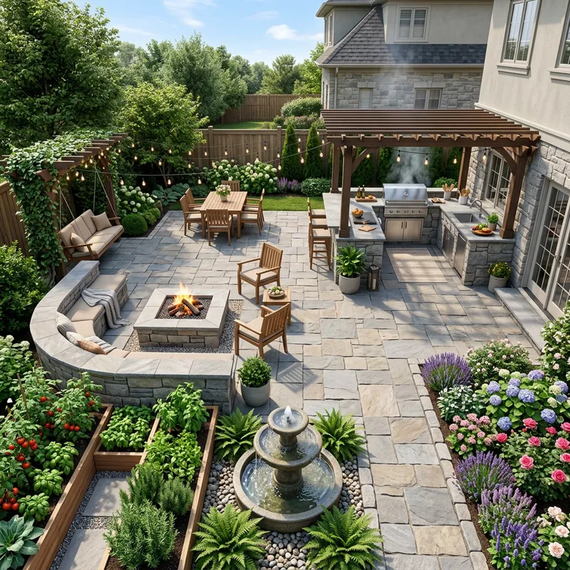 Exquisite 30x25 Feet Paver Patio Design with Grill, Fire Pit & Garden