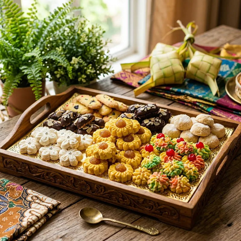 An array of traditional Aidilfitri cookies beautifully arranged on a festive tray. Each cookie is intricately designed and decorated, exhibiting the true essence of the craftsmanship that goes into the baking process. The tray is placed on a wooden table, with a rustic charm that complements the vibrant colors of the cookies. A lush green plant in the background adds a touch of freshness to the entire scene.