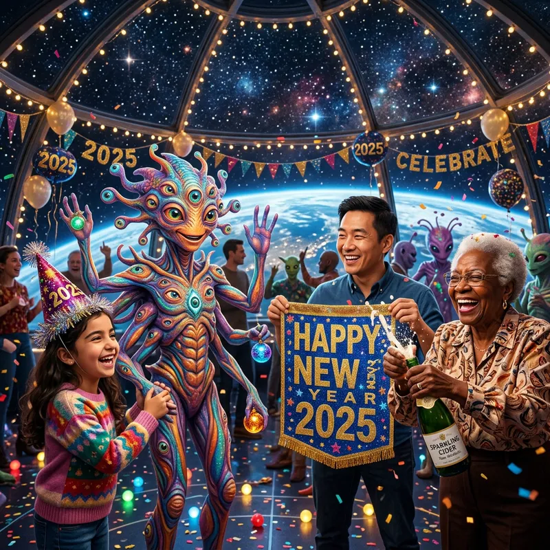 An alien species interacting with humans to celebrate the New Year. The extraterrestrials are depicted as sentient beings with extravagant colors, differing from humans with vast number of limbs, and eyes in places not seen on human bodies. The humans shown include a young Middle-Eastern girl wearing a festive party hat, a grown Asian man holding a 'Happy New Year' banner, and an elderly Black woman popping open a bottle of non-alcoholic champagne. They are all smiling, showing the universality of such celebrations. Stars twinkle in the background, hinting that the celebration is taking place in outer space.