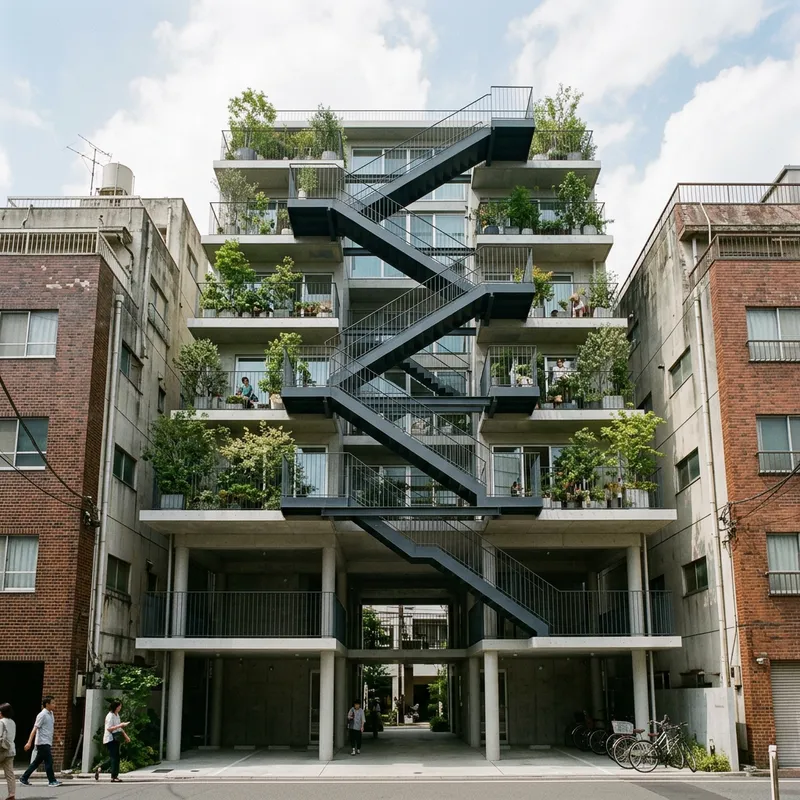 Facade of a 7-story residential building between buildings with garden terraces connected by metal circulation. Elevated two floors above ground level.