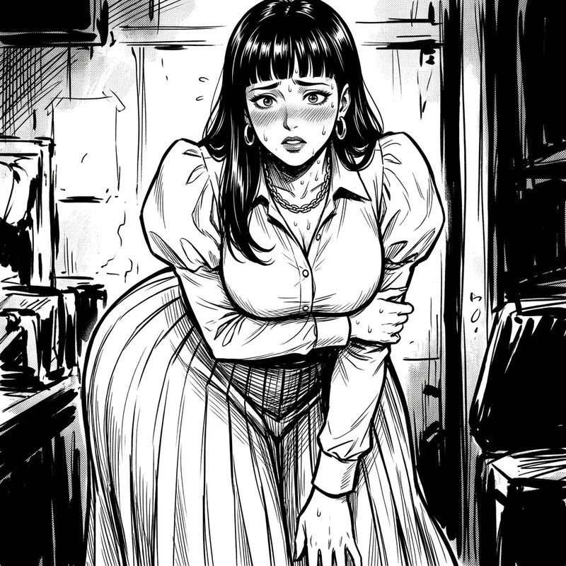 facing viewer, sweaty, embarrassed, ass swelling, flustered, wide hips, overweight, best quality, majestic quality, unrealistic proportions, big, huge ass, gigantic ass, ass expansion, masterpiece, thick thighs, leaning forward, 1girl, mature female, solo, blackwhiplash style, Otoha Kurogane (RockLady), jewelry, black hair, purple eyes, blunt bangs, long hair, white shirt, white skirt, long skirt, puffy sleeves, pleated skirt, juliet sleeves