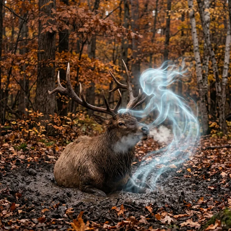 Generate a realistic image of an elk that's stuck in a mud pit during the fall season. The elk is visibly breathing, evident from its condensed breath in the cold air. A ethereal spirit is seen making effort to free the elk from its predicament. The colors of the fall, orange and brown leaves, add a tinge of melancholy to the scene.