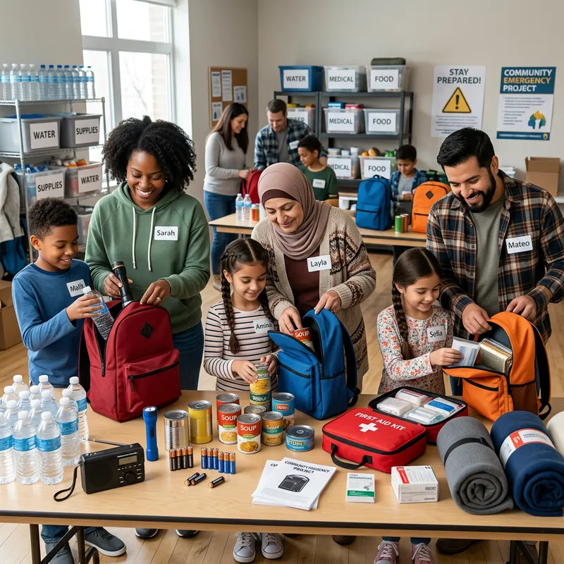 A detailed depiction of diverse families diligently packing emergency kits. In the scene is a Hispanic father and daughter, a Black mother and her son, and a Middle-Eastern grandmother with her granddaughter. They are all cooperating and working together to prepare for emergencies. Essential items such as water bottles, canned food, flashlights, batteries, medicine, blankets, and a first aid kit can be seen being packed. The environment is calm and organized, emphasizing the importance of preparedness.