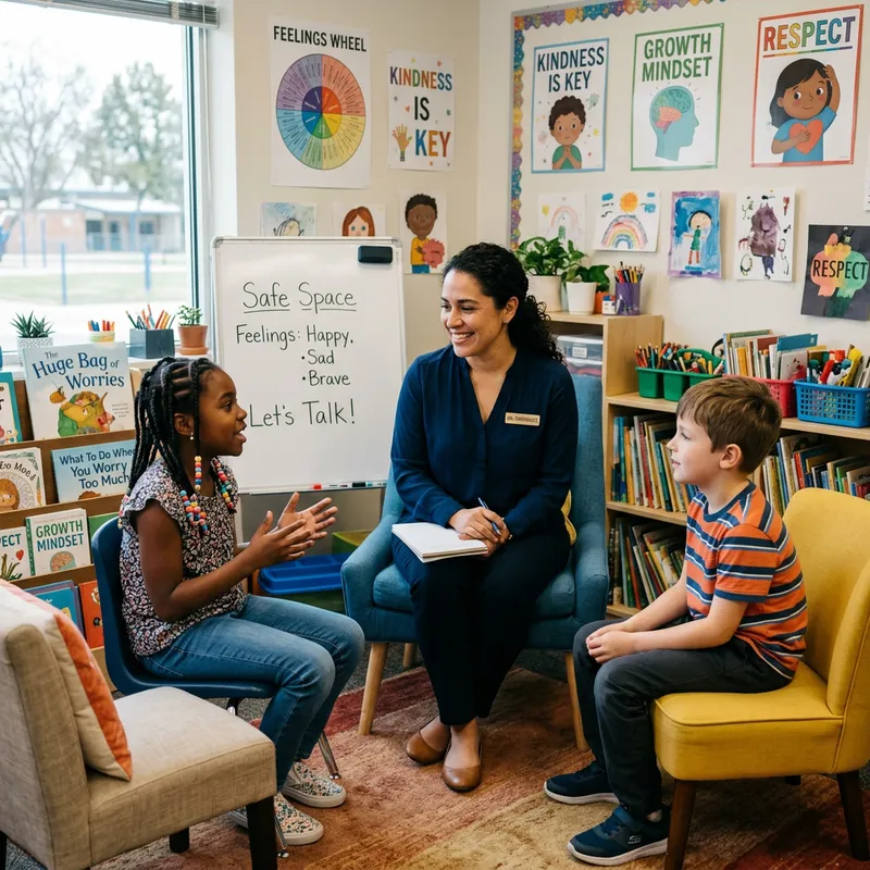 Realistically depicted family counseling session in a school setting. The scene takes place in a comforting, brightly lit room filled with educational materials and age-appropriate decorations. The environment is calm and welcoming, promoting a sense of warmth and trust. Included in the scene are two students, a Caucasian boy and a Black girl, engaged in an open conversation with a Hispanic female counselor. The counselor fosters a supportive atmosphere, attentively listening and offering thoughtful responses. Additional elements could be seating arrangements, such as a circular arrangement of chairs, and other elements indicating an educational environment such as a blackboard, books, and educational posters.