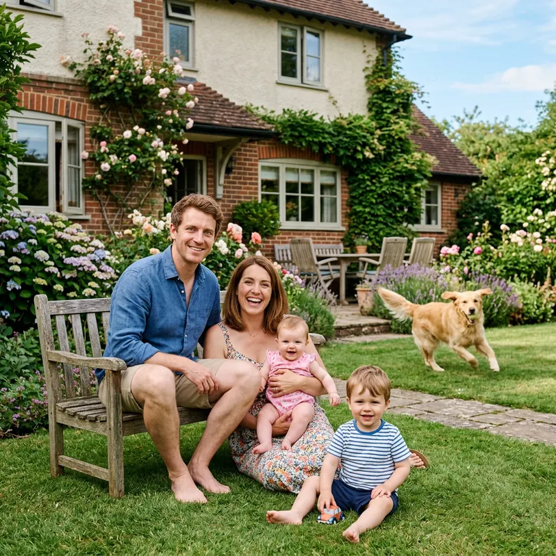 A family in the garden of a house. A green-eyed Caucasian man with chestnut hair, a brown-eyed Caucasian woman with chestnut hair, a small toddler boy, and an infant girl. In the background, there's a dog running.