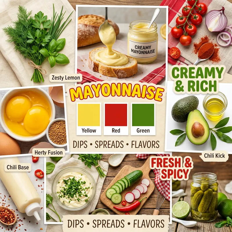Create a moodboard with yellow, red, and green related to mayonnaise.