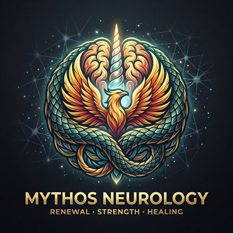 Visualization of a logo representing neurological treatment, but with a creative twist, it incorporates elements of mythical creatures. A key representation is a brain, an iconic symbol of neurology, intricately connected with elements of fantasy. Perhaps these elements could include a dragon's scales representing strength, a unicorn's horn for magic and healing, or a phoenix feather implying renewal. The design flawlessly intertwines the medical and fantastical realms, thereby metaphorically signifying top-tier creature-like resilience and recovery in the face of neurological issues.