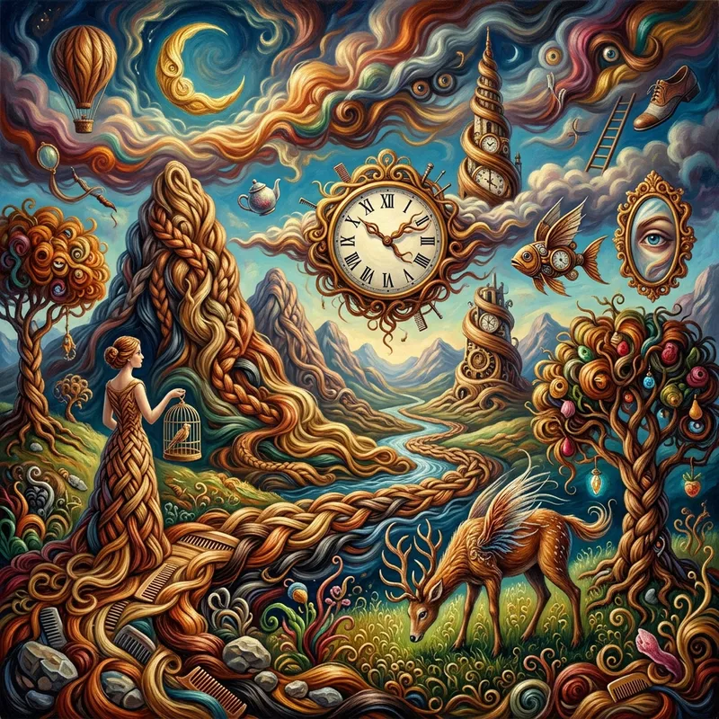 A surrealistic image featuring distorted landscapes and objects, with a prominent theme of hair. Let it be fantastical and dreamlike, abounding with unexpected juxtapositions and non sequitur elements, consistent with the surrealism art movement of the early 20th century. Use a rich, vibrant color palette like the traditional one in oil paintings.