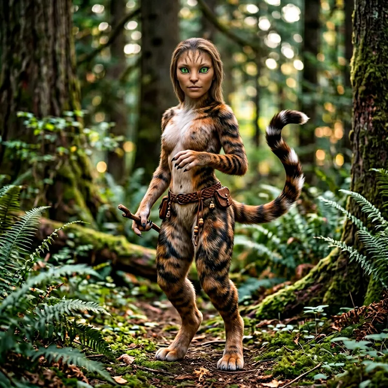 A fantastical creature born from the fusion of human and cat DNA. It stands upright like a human, its body arrayed in a mix of leathery human skin and short, sleek feline fur. Its face is human-like in structure yet features slanting cat-like eyes and a smaller, supple nose reminiscent of a cat's. Tufts of fur jut out from behind its ears, and its hands end in slightly curved, non-threatening claws. Its legs, while human in structure, are slightly more muscular and end in feline paws. Its long, agile tail swings behind in rhythmic motion, expressing its curious and playful nature.