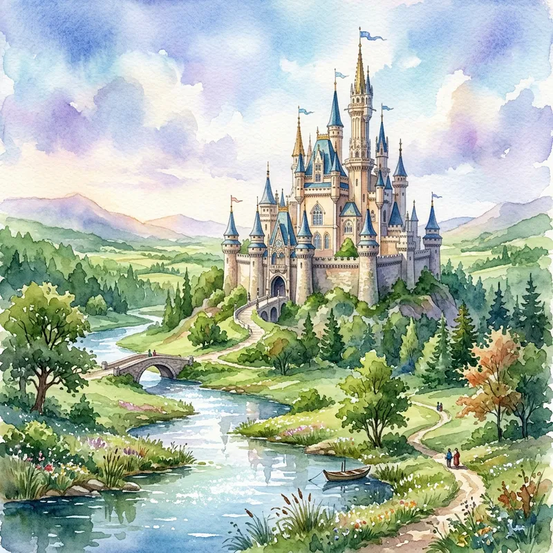 Majestic Fantasy Castle in Serene Watercolor