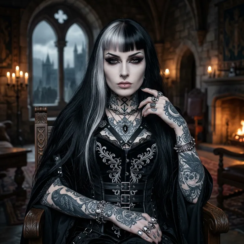 A goth woman of Caucasian descent exuding a coldly beautiful aura, with pale skin, and unassuming cheeks. Her piercing eyes are decorated with dark winged eyeliner. Her long, jet black hair is highlighted with a streak of silver-white. She sports tattoos and has several facial piercings. Her confident and superior expression adds to her distinct persona. This image must be executed in high-definition, capturing the unconventional elegance of her gothic look. The overall aesthetic should resonate with the fantasy genre.
