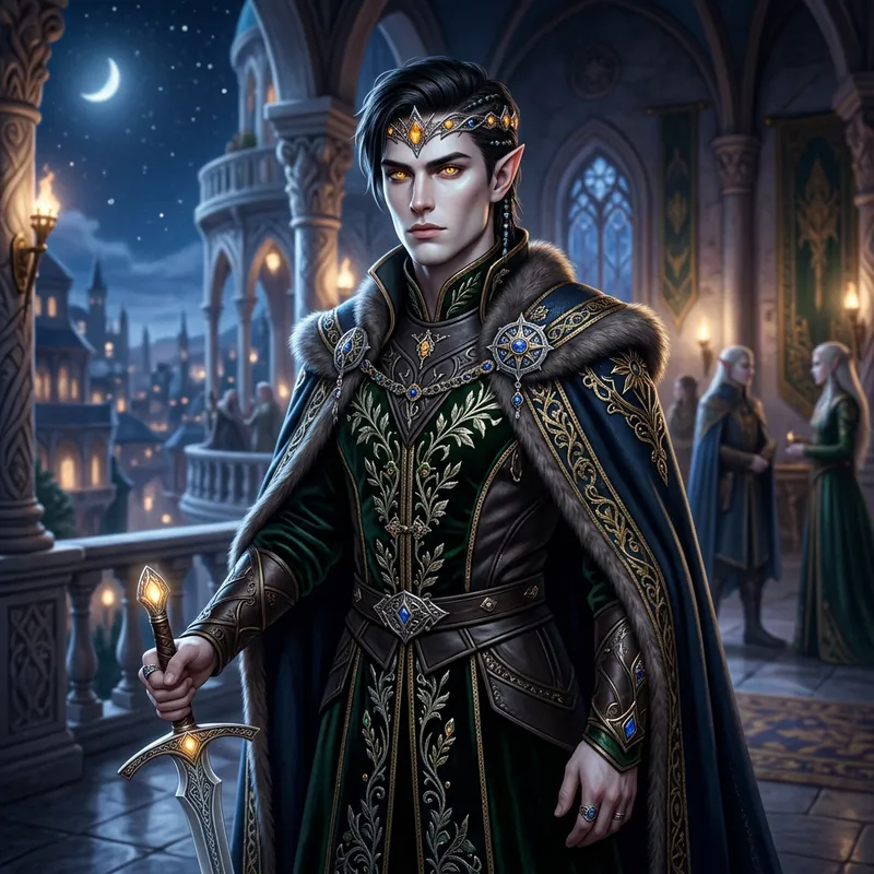 An image of a fantasy male elf prince with sharp cheekbones and short black hair. His skin is pale and his eyes are glowing with a golden hue capturing a sense of authority and subtle elegance.