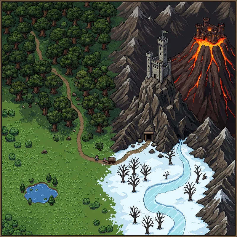 Create a detailed pixel art image from a bird's eye view, showing a variety of geographical and architectural elements. Starting from the far left, there should be a grassy plain populated with several bushes and a tiny lake. Adjacent to the plain on its right, there should be an oxen oak forest occupying the upper half of the field of view. Further right, high, steep mountains rise without any snow cap. A tall, but slim castle, topped with a large tower, should be perched on one of these mountains with a small mine entrance visible at its base. Just below these mountains, a small snowy area exists featuring a few leafless, barren trees and a frozen river. To the far right of this scene, a large, steep volcano rises majestically with lava flowing out of it. A small fire-themed castle is located precariously at the volcano's edge. These diverse habitats and structures should seamlessly transition into each other in a way that evokes a sense of adventure and curiosity, all encapsulated within a nostalgic pixel art aesthetic.