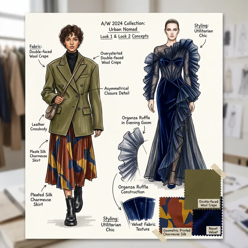 Fashion design illustration with detailed garment concepts, runway-ready clothing sketches with fabric details and styling, haute couture or ready-to-wear fashion visualization, professional fashion illustration suitable for lookbooks and collections.