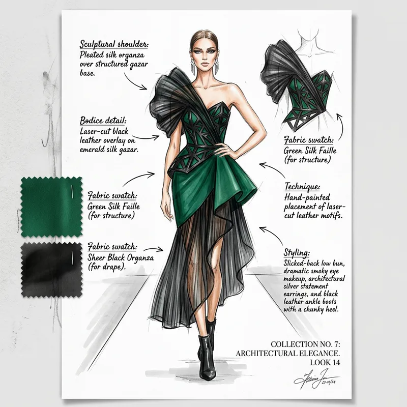 Fashion design illustration with detailed garment concepts, runway-ready clothing sketches with fabric details and styling, haute couture or ready-to-wear fashion visualization, professional fashion illustration suitable for lookbooks and collections.