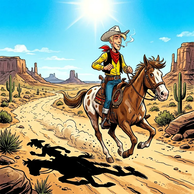 An illustration of a cowboy character wearing a white hat, blue jeans, yellow shirt and red bandana, riding on a horse in the middle of a desert in the west, high noon sun casting strong shadows. This cowboy has a thin frame and is known to be faster than his own shadow. He is a man of fair skin and blonde hair, and he is often seen with a rolled cigarette in the corner of his mouth, with a charismatic and calm expression on his face.