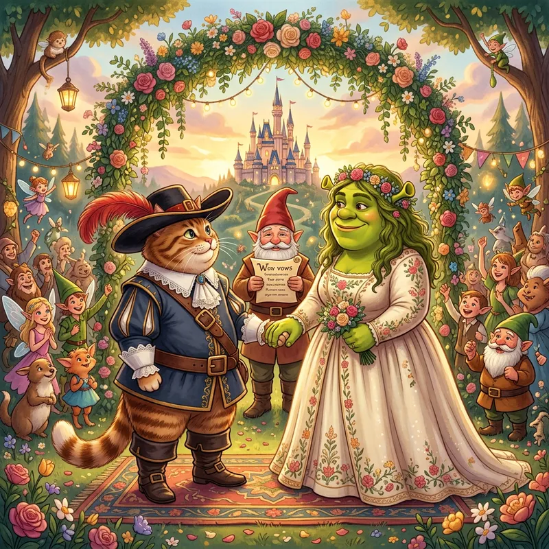 An overweight tabby cat in cavalier outfit similar to a fairy tale feline character, and a large, friendly green ogre with distinctive ears, exchanging wedding vows under a canopy of flowers, officiated by a kind gnome. The cat is decked in his classic costume with a wide-brimmed feathered cap, a belt with a buckle, and boots. The ogre is in a formal attire fitting his stature. They're surrounded by a crowd of mythical creatures cheering for them. The setting is a fairyland, complete with a castle in the background, under a warm sunset light. Please maintain the friendly tone in the image.