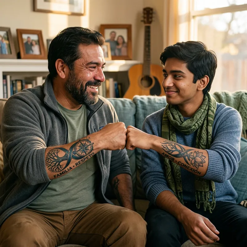 Generate an image of a Hispanic father and an South Asian son, depicted as having a deep emotional bond, fist bumping with a warm background setting. The atmosphere is filled with love and respect they have for each other. The tattoo design showcases strong, bold lines to emphasize the connection between the two figures. The color palette should incorporate muted shades of blue, green and a hint of earthy browns.