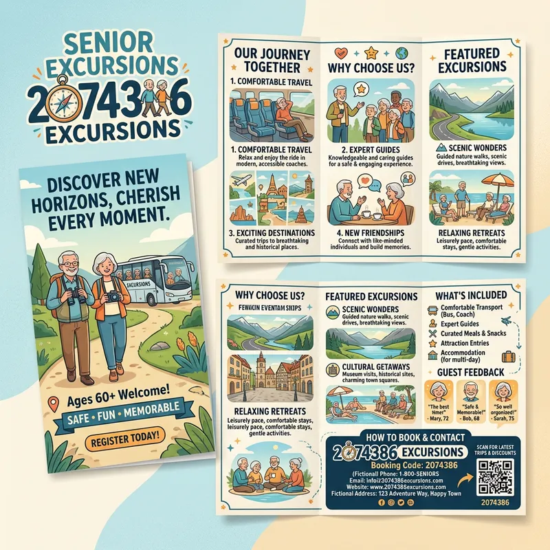 Create a brochure for seniors excursions with my logo and a catchy phrase.