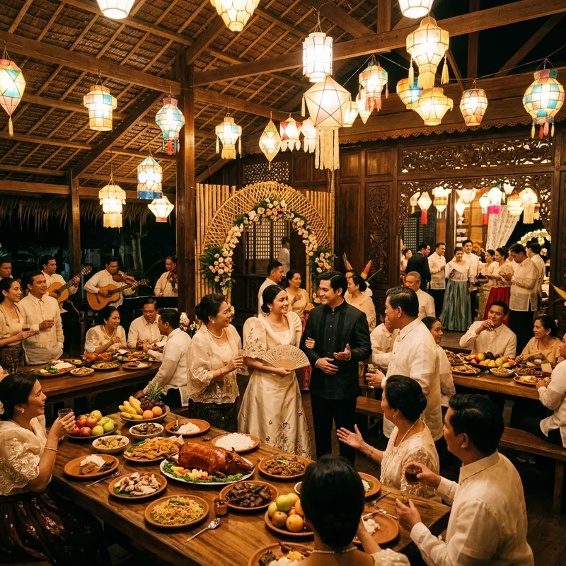 Scene 8: A feast at the house of Capitan Tiyago. A large feast is being held in the house of Capitan Tiyago to announce the marriage union of Maria Clara and Alfonso Linares. The house is an old Philippine house, glowing with the warm light of numerous festive lanterns. Guests are engaged in cheerful conversation, savoring the traditional Filipino delicacies served on long wooden tables. Maria Clara and Alfonso Linares are at the center of the celebration, their impending nuptials a cause for genuine happiness and excitement amongst the attendees. The house, adorned with native materials like Nipa and Bamboo, exhibits the distinct charm of the traditional Filipino architectural design.