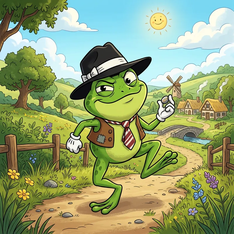 A cartoon character, similar to a humorous amphibian, wearing a classic fedora hat. The character is green in color, with large round eyes and a slight smirk that gives it a cheeky expression. The fedora hat is black, with a wide brim and a white band around the base. The character is exhibiting playful mischief within an animated countryside setting, under a bright, clear sky.