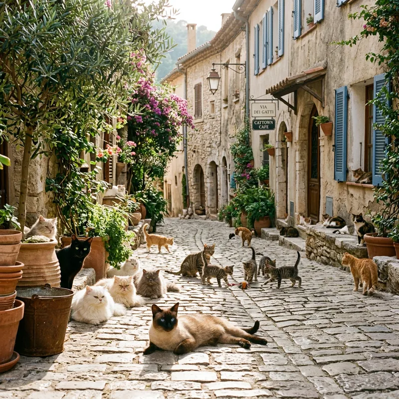 Imagine a narrow cobblestone street under the glistening afternoon sun. All along the street, there are numerous cats of various breeds, colors, and sizes. Siamese cats with their striking blue eyes lay lazily on the sun-warmed stones. Persian cats with their long, fluffy fur bask under the dappled shade of overhanging trees. Black cats with their penetrating green eyes peer curiously from behind rusty old buckets. Tiny tabby kittens scamper around playfully, their joyful, squeaky meows echoing through the air. The street is a harmonious spectacle of feline grace and tranquility, a surreal dreamscape for any cat lover.