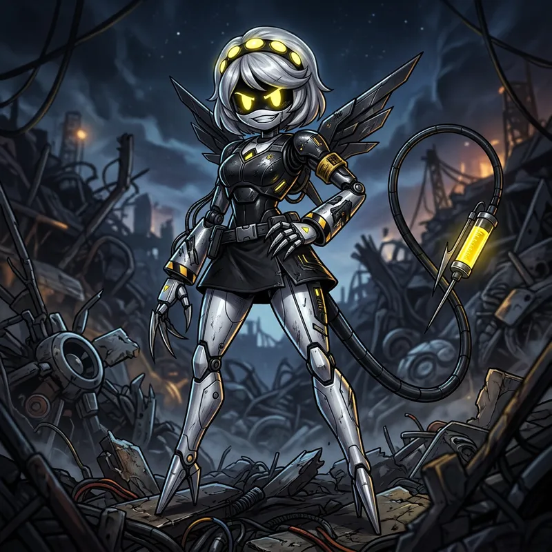 A drone dismantler with yellow neon eyes and short silver hair. Just like other dismantler drones, she has a black headband featuring five yellow sensors and a long, black tail that ends with a syringe filled with nanite acid. Female versions of these drone dismantlers appear to have a semblance of a waist and hips. She is portrayed with white colored legs that narrow down to a 'foot'.