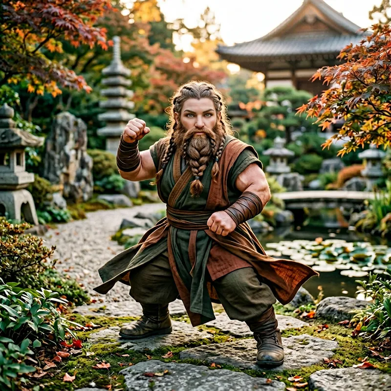 A female dwarf with a brown beard is observed. Known for her monastic ways, she is represented in a traditional fighting stance. Her monk robe, featuring earth tones, flutters around her compact but muscular frame. The scenery around her is suggestive of a tranquil garden, which harmonizes with her spiritual journey. The warm sunlight falls over her, accentuating the composed determination in her grey eyes. Her fists are clenched, ready for action. The overall image embodies the serenity of a monk coupled with the strength of a warrior.