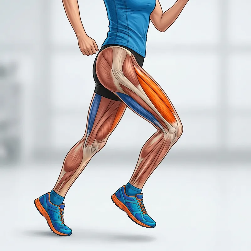 Visualize the anatomical structure of a female runner's side thigh. Highlight the major muscle groups, namely the quadriceps muscle at the front of the thigh in a vibrant color and the hamstring muscle at the back in a different color. The individual should obviously appear to be a runner, with athletic attire such as shorts and running shoes. The view should be from the side, capturing the entire length of the thigh from hip to knee. The illustration should not include any text or labels.