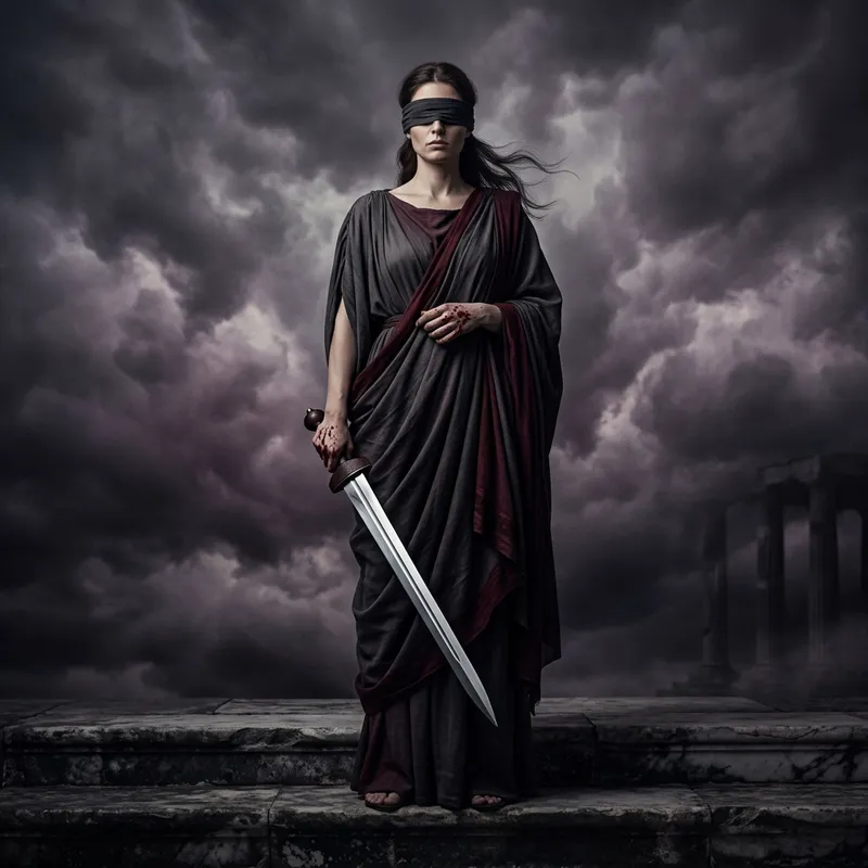 Depict Femida, the goddess of justice, in a dramatic setting. She should be presented as a tall, slender figure, adorned in traditional robes, with a blindfold firmly set on her eyes. In her firmly grasped hand should be a sharp, gleaming sword. On her hands, there should be a few splatters of blood, symbolizing the harshness of justice. The background should be a dark, cloudy sky, creating a mystic and ominous aura. The overall image should project a sense of stern authority and the unforgiving nature of justice.