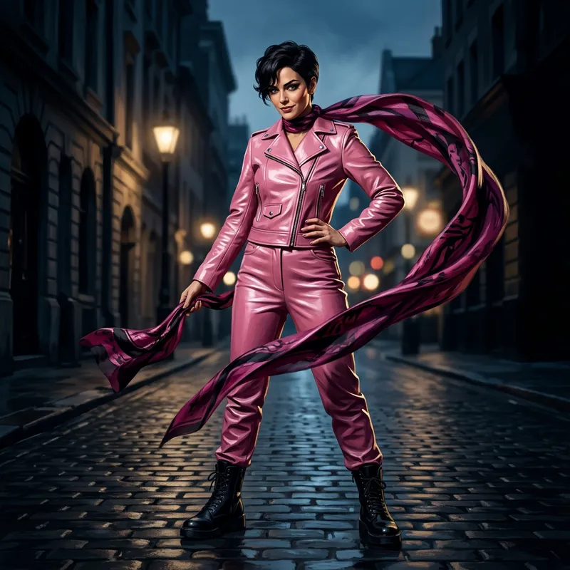 A woman, standing imposingly in a pink leather outfit complimented by black boots. She wields a scarf that swirls dramatically in the air. She has an aura of absolute confidence and power. The art style should be influenced by dramatic photography which heavily relies on high contrasts accounting for bold shadows. Her pose is not just confident but expressive. The final rendering should be a digital painting that showcases a blend of vibrant colors, glossy textures, and a fine balance of shadows and highlights. Her persona can be likened to that of a femme fatale.