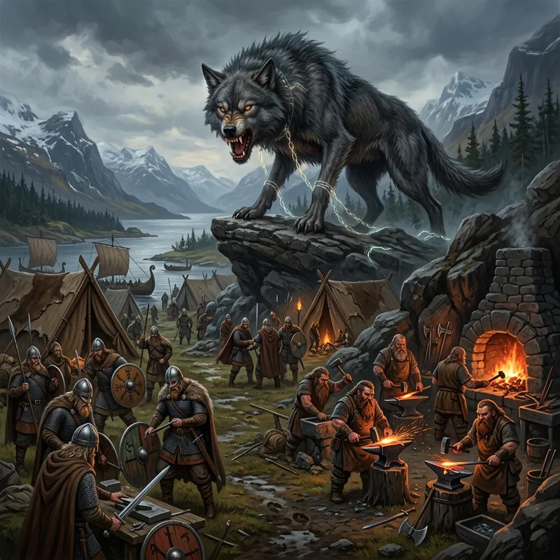 An image depicting Fenrir, the monstrous wolf from Norse mythology, looming large over a scene of Viking warriors preparing for battle. Off to one side, a group of dwarves are busily smithing weapons. The Vikings are clad in their traditional fur and metal armor, while the dwarves are hunched over a roaring forge, sparks flying from their hammers as they beat molten metal into fearsome tools of war.