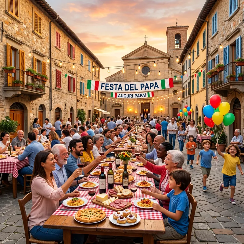 An Italian celebration called 'Festa del Papa' happening in a quaint town square. Tables covered in checkered cloths are spread with delicious food and drinks. A group of cheerful people, comprised of diverse ethnicities and genders, are gathered around, engaging in lively chatter. Kids are running around playing with colorful balloons. The sun is setting painting the sky with warm hues. Old stone buildings with colorful shutters surround the scene. There is an air of warmth and joy filling the atmosphere.