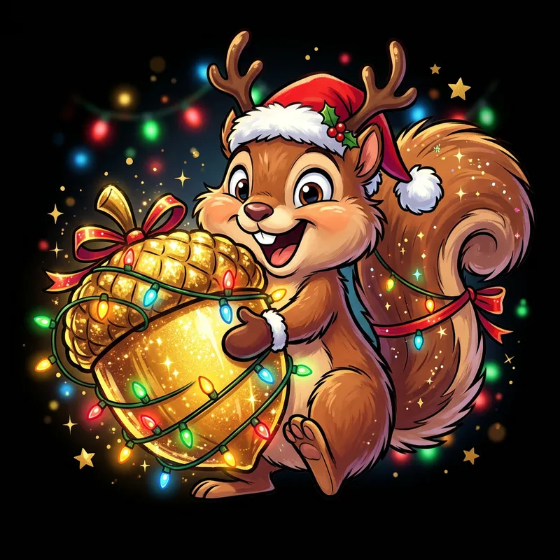 Create an image that uniquely embodies the joyous spirit of the holiday season. The scene should be set against a sleek black background, featuring a lovable cartoon squirrel centrally positioned. This squirrel should be adorned with festive attributes such as a Santa hat and reindeer antlers. It should be interacting with a large, shimmering, golden acorn which is wrapped in colorful Christmas lights. The execution should have the dynamism and vibrancy of comic book portrayals with bold outlines and bright colors. This scene should be rendered through a digital painting technique where soft brushstrokes are used to bring the image to life, adding a touch of whimsy to each element. The squirrel should be depicted with dynamic poses and expressive facial features to imbue the character with a sense of life and vivacity. This design should be suitable for t-shirt printing in terms of its resolution and aspect ratio.