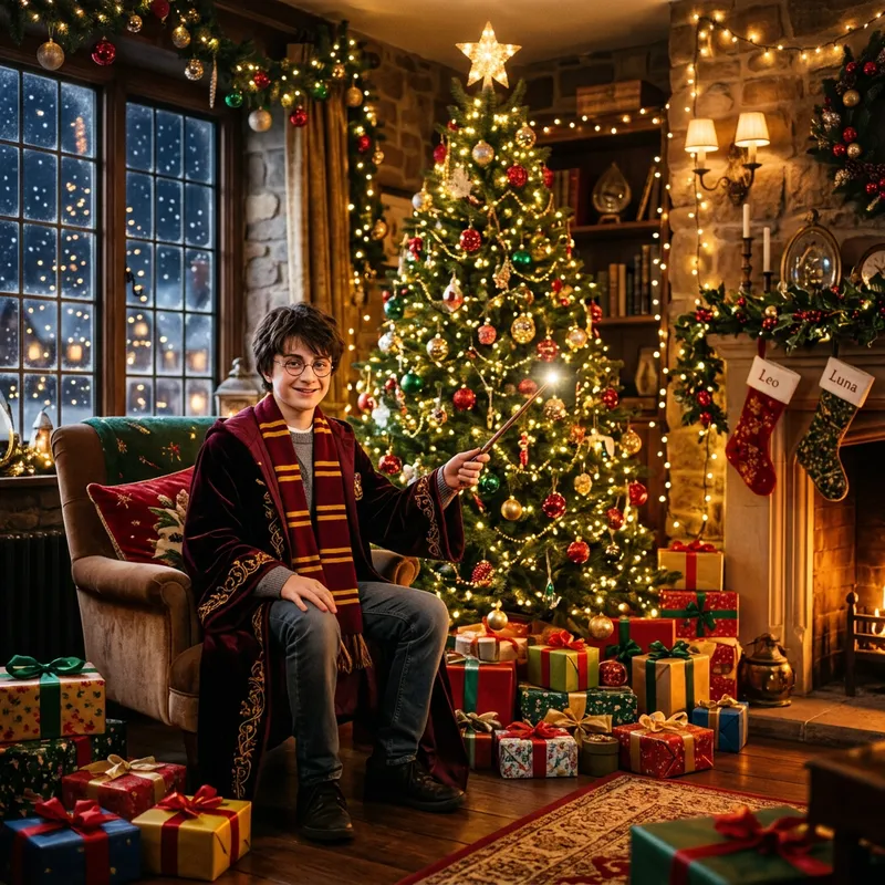 Festive Holiday Scene with Male Wizard and Christmas Decorations