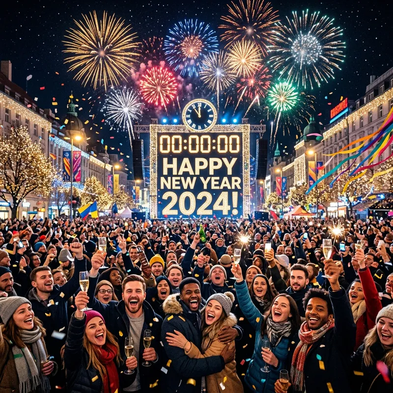 Visualize a festive scene of a New Year's celebration. Imagine a lively crowd of people from diverse backgrounds cheering and toasting their glasses. In the center, there's a large, dazzling countdown clock on the verge of reaching zero. Bright fireworks are bursting in the sky in various shapes and colors, illuminating the dark starry night. The ambience is filled with overwhelming joy and enthusiasm as people are excitedly welcoming the new year. The city scape in the background is beautifully decorated with twinkling fairy lights and vibrant streamers fluttering in the cold winter breeze.