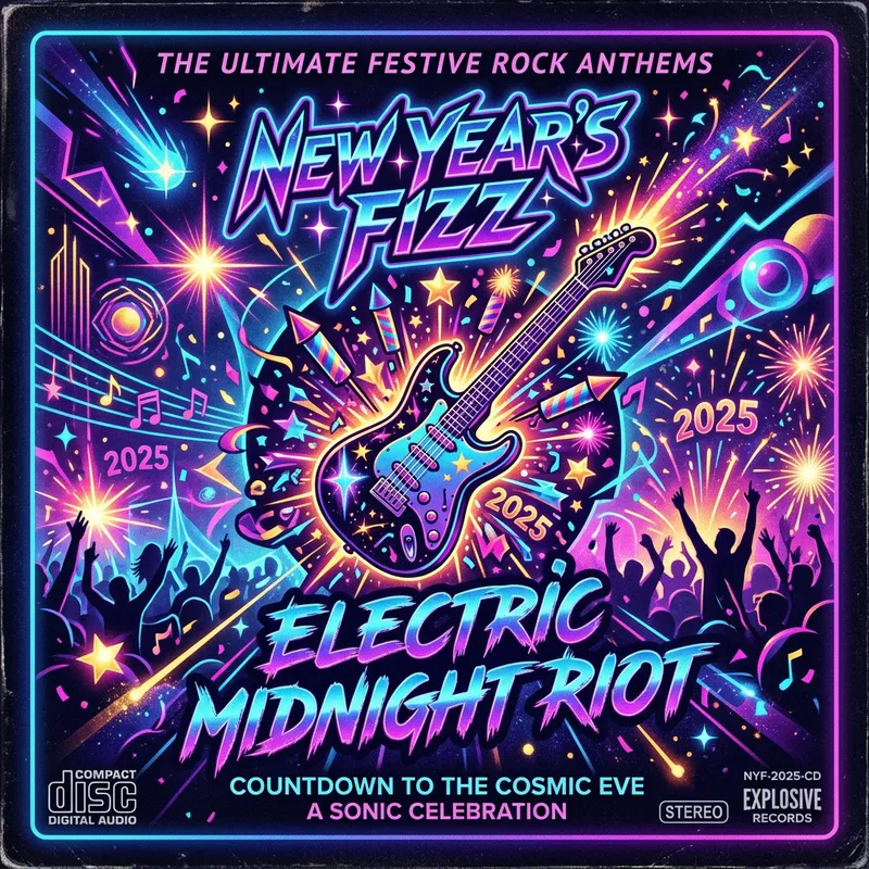 Generate an image of a CD cover with a festive rock-themed style. The album carries influences from both the background and rock genres, paired with hints of a New Year's celebration. The background of the cover should radiate neon blue and purple shades, emanating a retro vibe. Instead of landscapes, concentrate on graphic elements that give a sensation of being in a different world. The cover should be eye-catching and bring feelings of nostalgia and celebration.