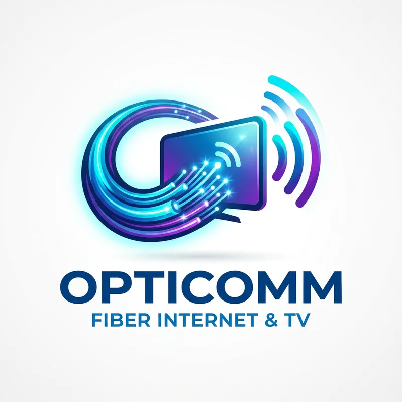 Create a visually appealing logo for a company that offers services in the realm of internet and television provision via fiber-optic technology. Incorporate design elements that reflect strong and fast fiber-optic connection. The colors should convey innovation, reliability, and speed. The design should include depictions of a fiber optic cable, an abstract TV screen, and stylized network waves.