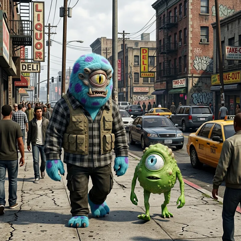 Create an image where, in the setting of a gritty, 3D urban cityscape characteristic of 'Grand Theft Auto 5', two fictional characters are featured. The first one is a tall, bulky figure, completely covered in bright blue fur with purple spots, and has an outsize eye, while the second one is a short, round creature, uncharacteristically green with a single eye in the middle of his head, just like cyclops mythological creatures, walking alongside the first one. They are casually navigating through the diverse urban environment which is bustling with traffic and pedestrians.